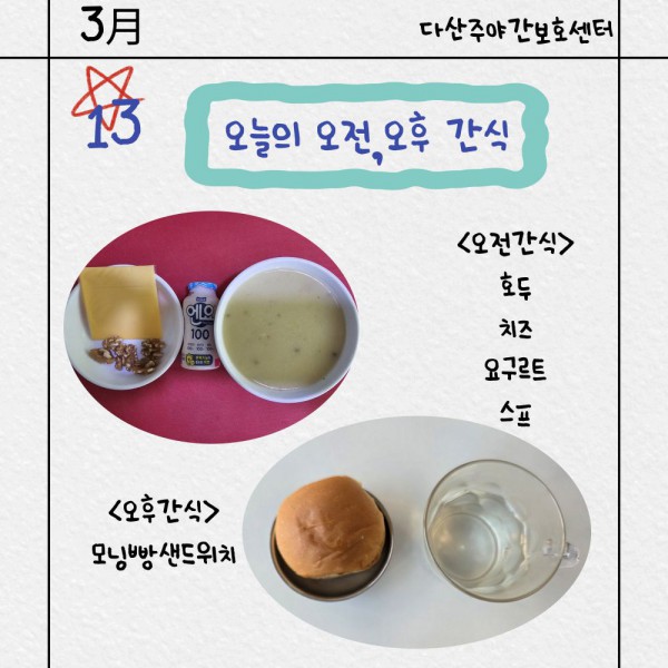 3월13일 오전/오후간식 페이지 정보 작성자 명품다산주야간보호센터 작성일26-03-13 15:24 조회602회 댓글0건 관련링크 이전글 다음글 목록 본문 오전/오후간식 입니다. 이전글 다음글 목록