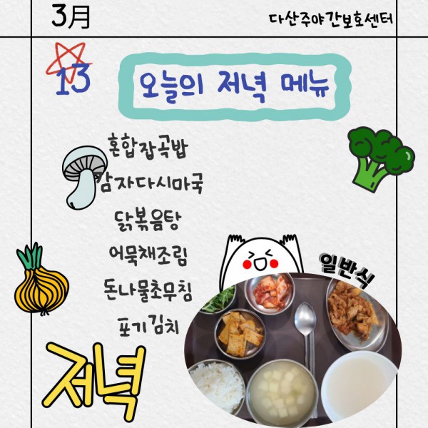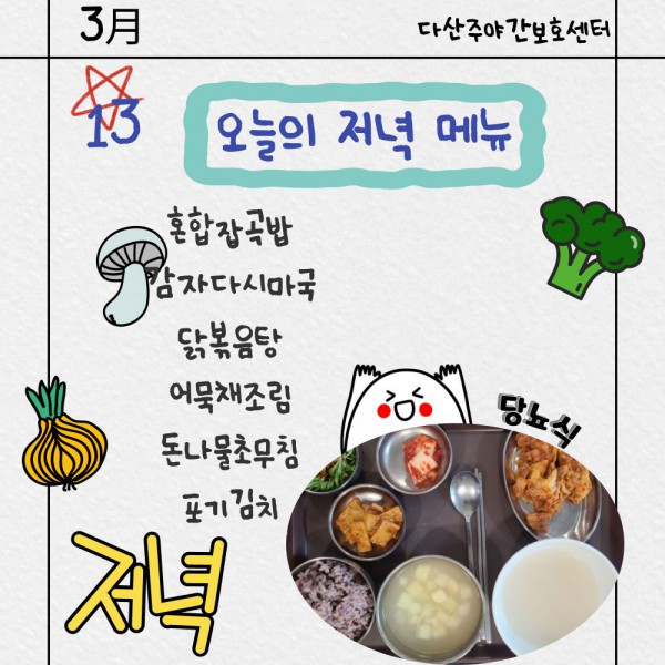 3월13일 저녁식단 페이지 정보 작성자 명품다산주야간보호센터 작성일26-03-13 16:04 조회600회 댓글0건 관련링크 이전글 다음글 목록 본문 저녁식단 입니다.(일반식,당뇨식) 이전글 다음글 목록