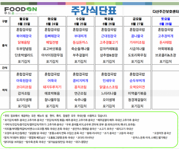 <<< 6월4주차 주간식단표 >>> 페이지 정보 작성자 명품다산주야간보호센터 작성일25-06-23 08:18 조회2,096회 댓글0건 관련링크 이전글 다음글 목록 본문 6월4주차 주간 식단표 입니다. 이전글 다음글 목록