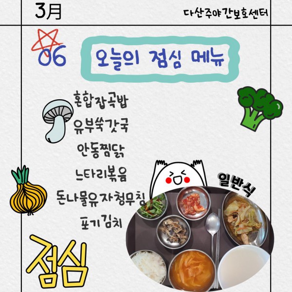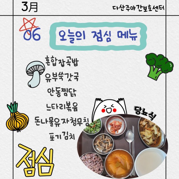 3월6일 점심식단 페이지 정보 작성자 명품다산주야간보호센터 작성일26-03-06 11:49 조회640회 댓글0건 관련링크 이전글 다음글 목록 본문 점심식단 입니다.(일반식,당뇨식,간반식) 이전글 다음글 목록