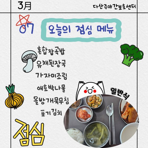 3월7일 점심식단 페이지 정보 작성자 명품다산주야간보호센터 작성일26-03-07 11:32 조회627회 댓글0건 관련링크 이전글 다음글 목록 본문 점심식단 입니다.(일반식,당뇨식) 이전글 다음글 목록