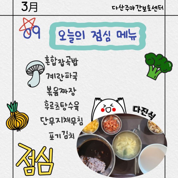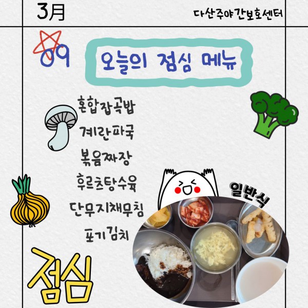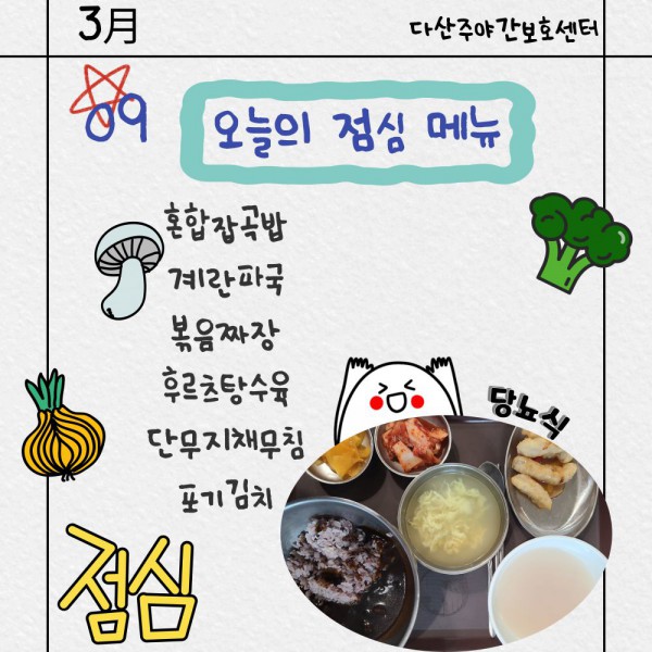 3월9일 점심식단 페이지 정보 작성자 명품다산주야간보호센터 작성일26-03-09 12:01 조회623회 댓글0건 관련링크 이전글 다음글 목록 본문 점심식단 입니다.(일반식,당뇨식,간반식) 이전글 다음글 목록