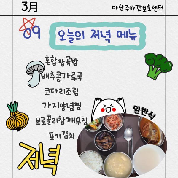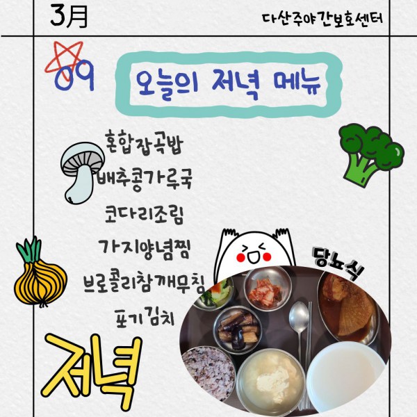 3월9일 저녁식단 페이지 정보 작성자 명품다산주야간보호센터 작성일26-03-09 16:11 조회633회 댓글0건 관련링크 이전글 다음글 목록 본문 저녁식단 입니다.(일반식,당뇨식) 이전글 다음글 목록