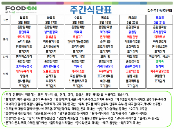 <<< 3월3주차 주간 식단표 >>> 페이지 정보 작성자 명품다산주야간보호센터 작성일26-03-16 08:51 조회607회 댓글0건 관련링크 이전글 다음글 목록 본문 3월3주차 주간 식단표 입니다. 이전글 다음글 목록