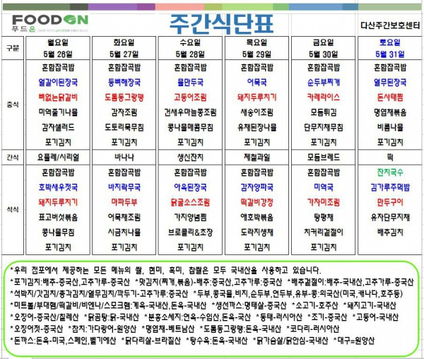 <<< 5월4주차 주간 식단표 >>> 페이지 정보 작성자 명품다산주야간보호센터 작성일25-05-26 09:24 조회2,139회 댓글0건 관련링크 이전글 다음글 목록 본문 5월4주차 주간 식단표 입니다. 이전글 다음글 목록
