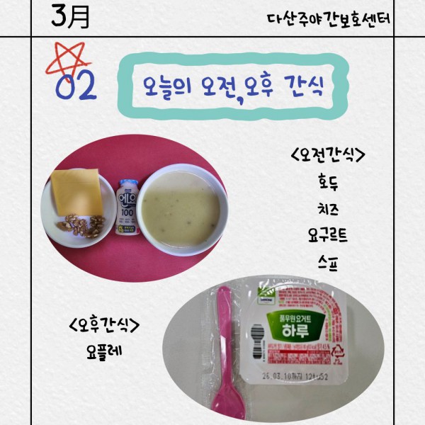3월2일 오전/오후간식 페이지 정보 작성자 명품다산주야간보호센터 작성일26-03-02 15:34 조회635회 댓글0건 관련링크 이전글 다음글 목록 본문 오전/오후간식 입니다. 이전글 다음글 목록