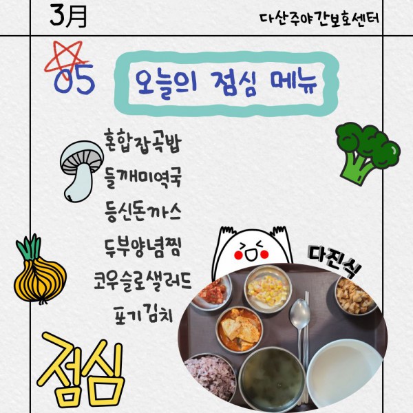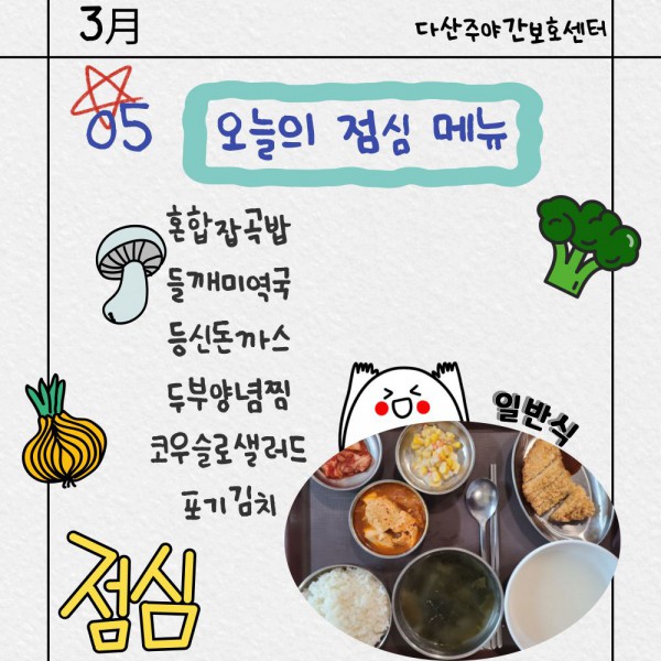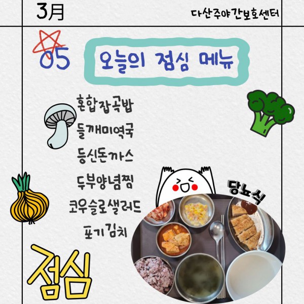 3월5일 점심식단 페이지 정보 작성자 명품다산주야간보호센터 작성일26-03-05 11:11 조회628회 댓글0건 관련링크 이전글 다음글 목록 본문 점심식단 입니다.(일반식,당뇨식,간반식) 이전글 다음글 목록