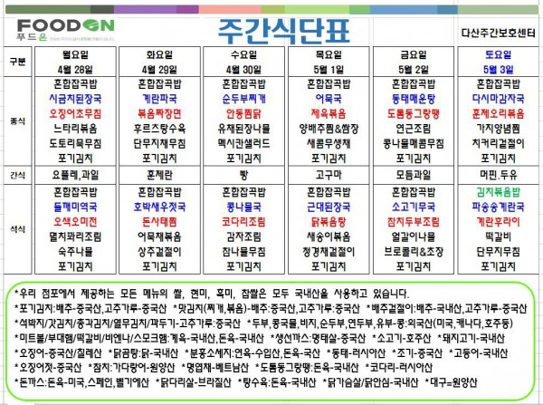 <<< 4월5주차 주간 식단표 >>> 페이지 정보 작성자 명품다산주야간보호센터 작성일25-04-28 09:31 조회2,186회 댓글0건 관련링크 이전글 다음글 목록 본문 4월5주차 주간 식단표 입니다. 이전글 다음글 목록