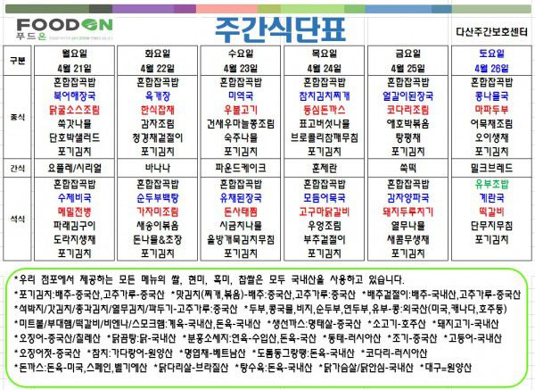<<< 4월4주차 주간 식단표 >>> 페이지 정보 작성자 명품다산주야간보호센터 작성일25-04-21 07:01 조회2,247회 댓글0건 관련링크 이전글 다음글 목록 본문 4월4주차 주간 식단표 입니다. 이전글 다음글 목록