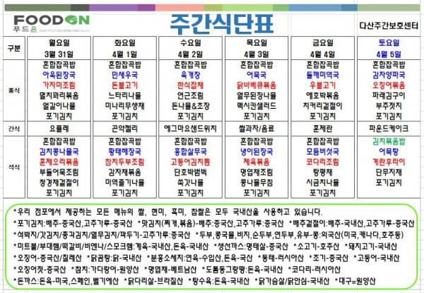 <<< 4월1주차 주간 식단표 >>> 페이지 정보 작성자 명품다산주야간보호센터 작성일25-03-31 07:51 조회2,354회 댓글0건 관련링크 이전글 다음글 목록 본문 4월1주차 주간 식단표 입니다. 이전글 다음글 목록