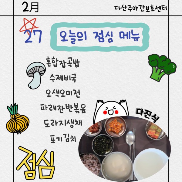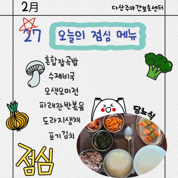 2월27일 점심식단 페이지 정보 작성자 명품다산주야간보호센터 작성일26-02-27 11:58 조회635회 댓글0건 관련링크 이전글 다음글 목록 본문 점심식단 입니다.(일반식,당뇨식,간반식) 이전글 다음글 목록