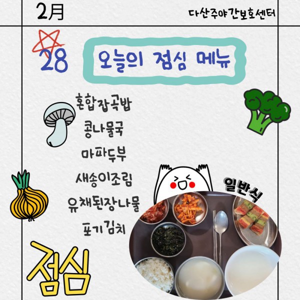 2월28일 점심식단 페이지 정보 작성자 명품다산주야간보호센터 작성일26-02-28 17:26 조회643회 댓글0건 관련링크 이전글 다음글 목록 본문 점심식단 입니다.(일반식,당뇨식,간반식) 이전글 다음글 목록