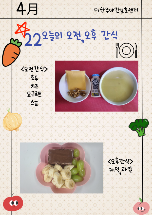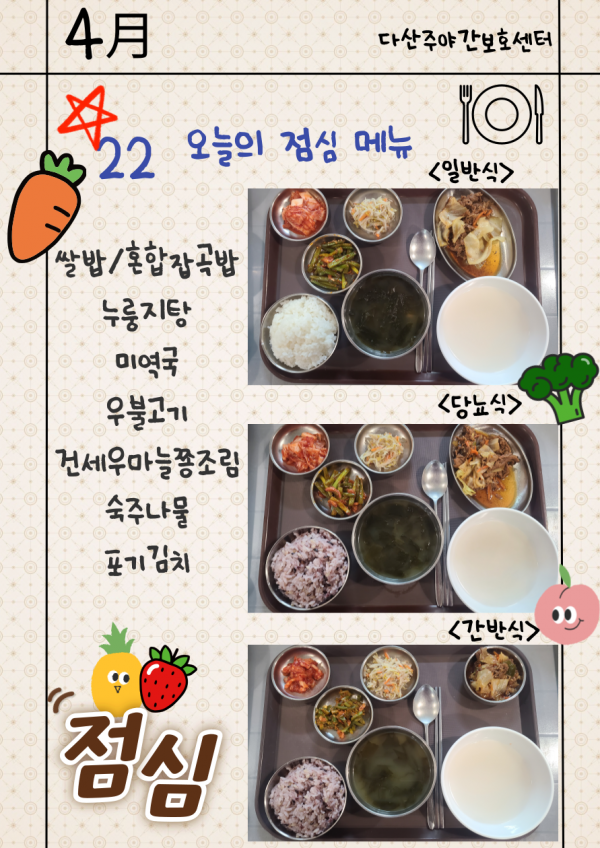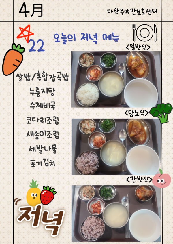 4월22일 (수요일) 오늘의 식단 페이지 정보 작성자 명품다산주야간보호센터 작성일26-04-22 16:07 조회15회 댓글0건 관련링크 이전글 다음글 목록 본문 오늘의 식단 입니다. 이전글 다음글 목록