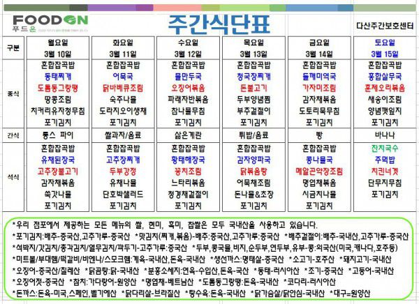 <<< 3월2주차 주간 식단표 >>> 페이지 정보 작성자 명품다산주야간보호센터 작성일25-03-10 07:51 조회2,431회 댓글0건 관련링크 이전글 다음글 목록 본문 3월2주차 주간 식단표 입니다. 이전글 다음글 목록
