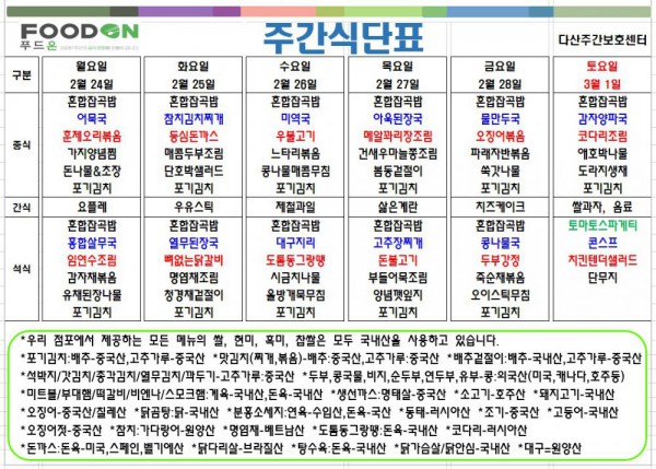 <<< 2월4주차 주간 식단표 >>> 페이지 정보 작성자 명품다산주야간보호센터 작성일25-02-24 09:33 조회2,422회 댓글0건 관련링크 이전글 다음글 목록 본문 2월4주차 주간 식단표 입니다. 이전글 다음글 목록