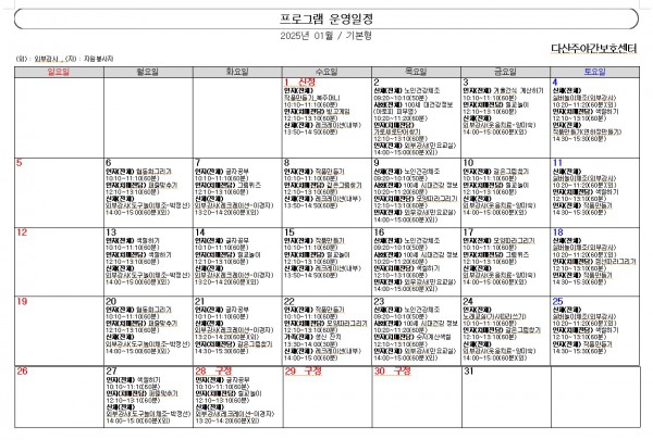 1월(월간) 프로그램 운영 일정표 페이지 정보 작성자 명품다산주야간보호센터 작성일25-01-06 07:18 조회676회 댓글0건 관련링크 이전글 다음글 목록 본문 1월 월간 프로그램 운영 일정표 입니다. 이전글 다음글 목록