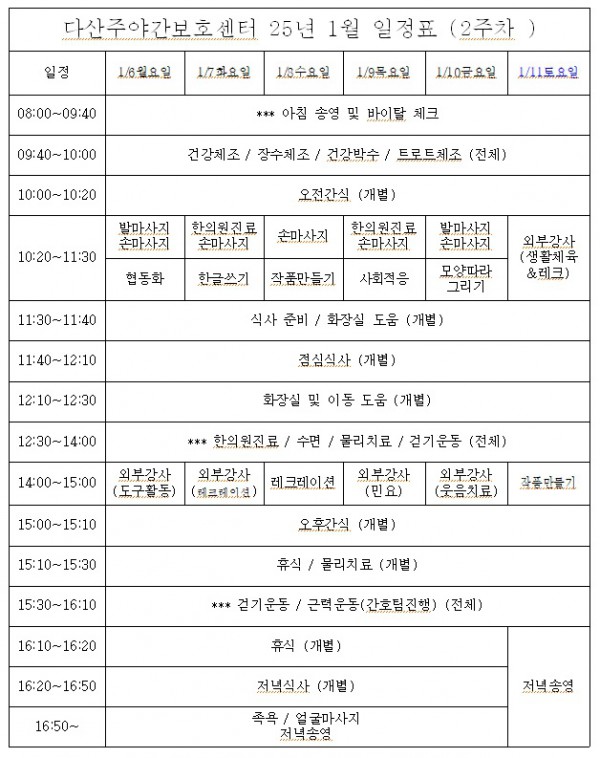 1월2주차 프로그램 일정표 페이지 정보 작성자 명품다산주야간보호센터 작성일25-01-06 07:47 조회691회 댓글0건 관련링크 이전글 다음글 목록 본문 1월2주차 프로그램 일정표 입니다. 이전글 다음글 목록