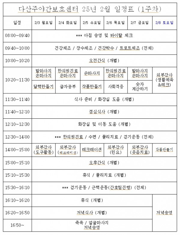 2월1주차 프로그램 운영 일정표 페이지 정보 작성자 명품다산주야간보호센터 작성일25-02-03 09:50 조회608회 댓글0건 관련링크 이전글 다음글 목록 본문 2월1주차 프로그램 운영 일정표 입니다. 이전글 다음글 목록