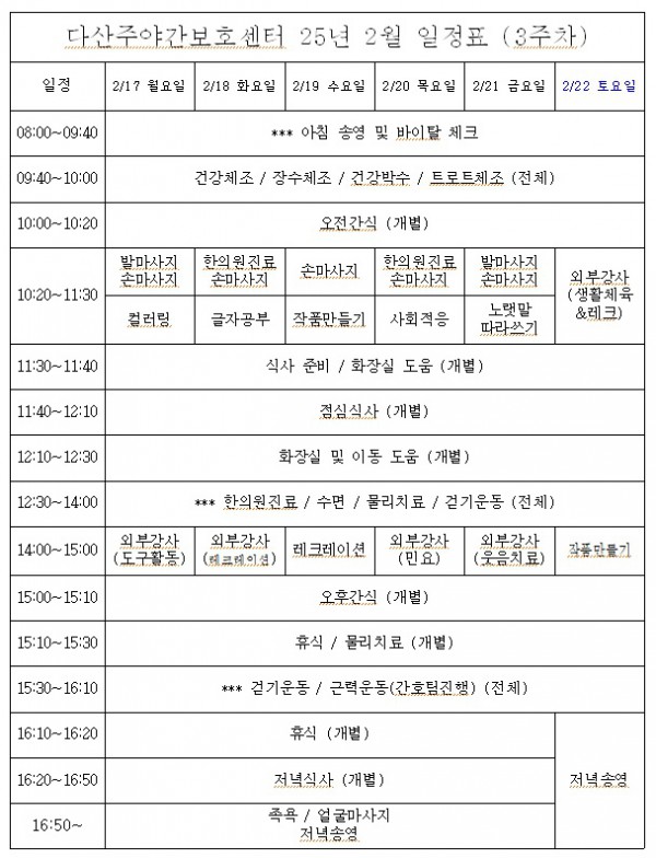 2월3주차 프로그램 운영 일정표 페이지 정보 작성자 명품다산주야간보호센터 작성일25-02-17 07:56 조회575회 댓글0건 관련링크 이전글 다음글 목록 본문 2월3주차 프로그램 운영 일정표 입니다. 이전글 다음글 목록