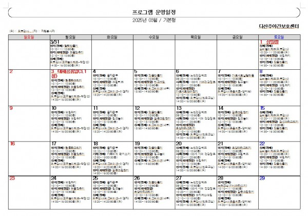 3월(월간) 프로그램 운영 일정표 페이지 정보 작성자 명품다산주야간보호센터 작성일25-03-01 13:00 조회552회 댓글0건 관련링크 이전글 다음글 목록 본문 3월달 프로그램 운영 일정표 입니다. 이전글 다음글 목록