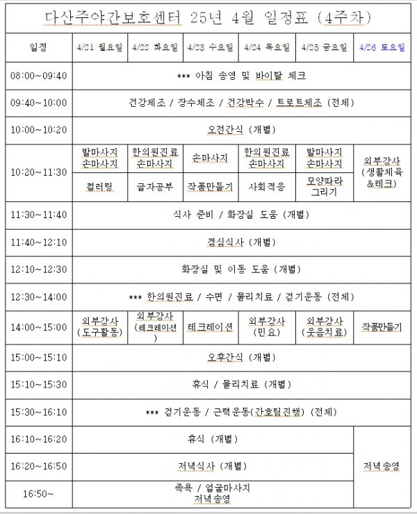 4월4주차 프로그램 운영 일정표 페이지 정보 작성자 명품다산주야간보호센터 작성일25-04-21 07:02 조회517회 댓글0건 관련링크 이전글 다음글 목록 본문 4월4주차 프로그램 운영 일정표 입니다. 이전글 다음글 목록