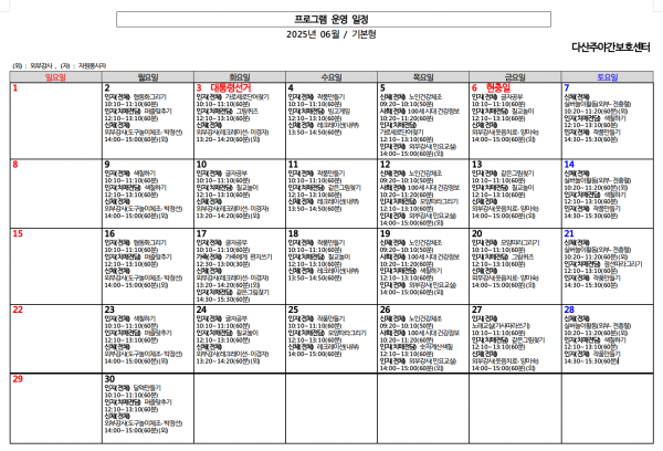6월(월간) 프로그램 운영 일정표 페이지 정보 작성자 명품다산주야간보호센터 작성일25-06-02 08:23 조회421회 댓글0건 관련링크 이전글 다음글 목록 본문 6월 월간 프로그램 운영 일정표 입니다. 이전글 다음글 목록