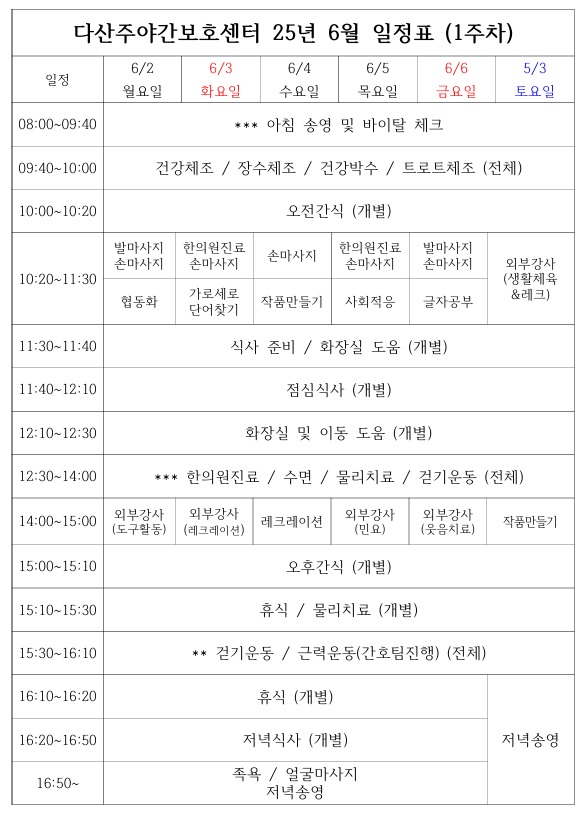 6월1주차 프로그램 운영 일정표 페이지 정보 작성자 명품다산주야간보호센터 작성일25-06-02 09:26 조회453회 댓글0건 관련링크 이전글 다음글 목록 본문 6월1주차 프로그램 운영 일정표 입니다. 이전글 다음글 목록