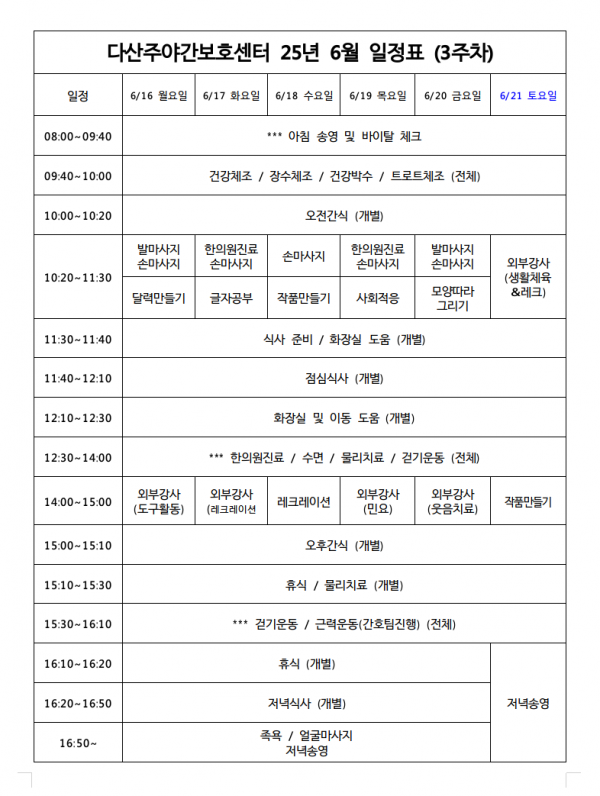 6월3주차 프로그램 운영 일정표 페이지 정보 작성자 명품다산주야간보호센터 작성일25-06-16 09:43 조회420회 댓글0건 관련링크 이전글 다음글 목록 본문 6월3주차 프로그램 운영 일정표 입니다. 이전글 다음글 목록
