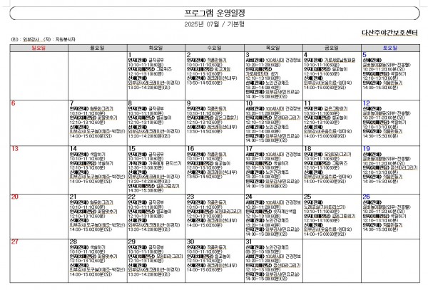 7월(월간) 프로그램 운영 일정표 페이지 정보 작성자 명품다산주야간보호센터 작성일25-06-30 11:22 조회387회 댓글0건 관련링크 이전글 다음글 목록 본문 7월 프로그램 운영 일정표 입니다. 이전글 다음글 목록