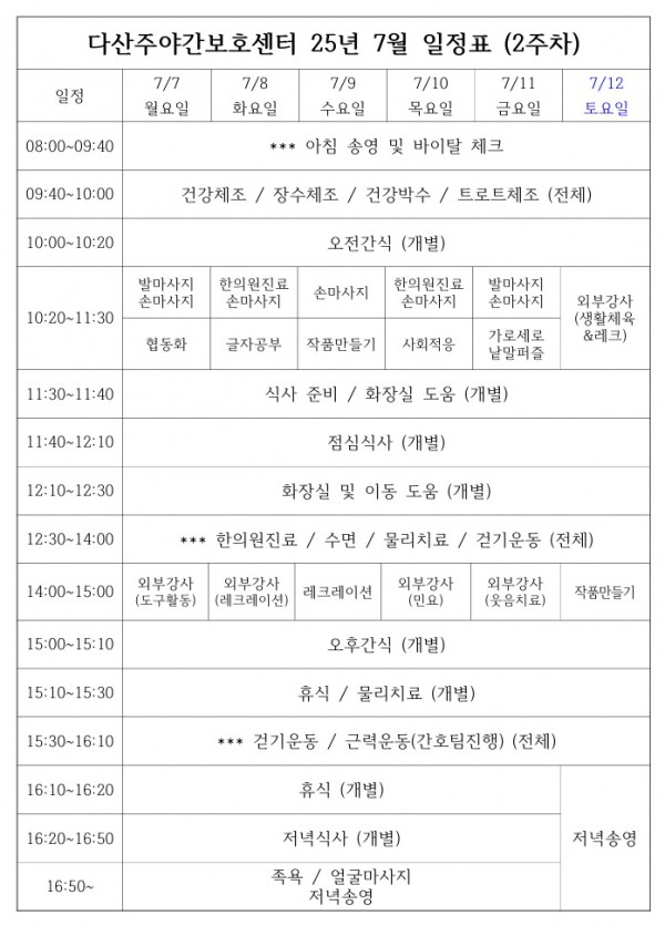 7월2주차 프로그램 운영 일정표 페이지 정보 작성자 명품다산주야간보호센터 작성일25-07-07 09:32 조회372회 댓글0건 관련링크 이전글 다음글 목록 본문 7월2주차 프로그램 운영 일정표 입니다. 이전글 다음글 목록