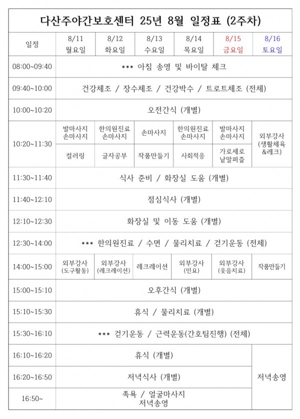 8월2주차 프로그램 운영 일정표 페이지 정보 작성자 명품다산주야간보호센터 작성일25-08-11 10:34 조회263회 댓글0건 관련링크 이전글 다음글 목록 본문 8월2주차 프로그램 운영 일정표 입니다. 이전글 다음글 목록