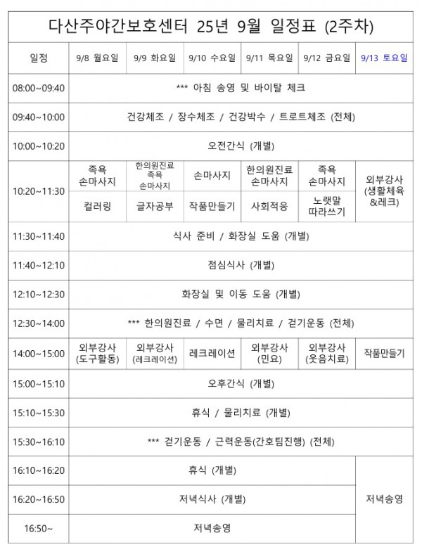 9월2주차 프로그램 운영 일정표 페이지 정보 작성자 명품다산주야간보호센터 작성일25-09-08 09:35 조회180회 댓글0건 관련링크 이전글 다음글 목록 본문 9월2주차 프로그램 운영 일정표 입니다. 이전글 다음글 목록