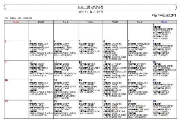 11월(월간) 프로그램 운영 일정표 페이지 정보 작성자 명품다산주야간보호센터 작성일25-11-03 07:29 조회299회 댓글0건 관련링크 이전글 다음글 목록 본문 11월 프로그램 운영 일정표 입니다. 이전글 다음글 목록
