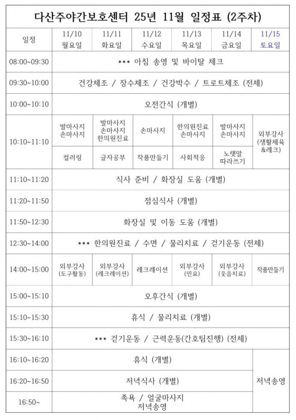 11월2주차 프로그램 운영 일정표 페이지 정보 작성자 명품다산주야간보호센터 작성일25-11-10 09:30 조회300회 댓글0건 관련링크 이전글 다음글 목록 본문 11월2주차 프로그램 운영 일정표 입니다. 이전글 다음글 목록