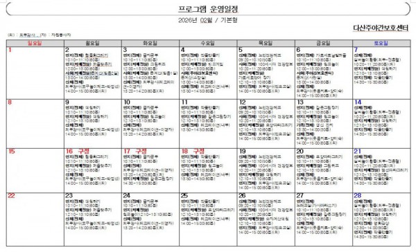 2월(월간) 프로그램 운영 일정표 페이지 정보 작성자 명품다산주야간보호센터 작성일26-02-02 10:58 조회129회 댓글0건 관련링크 이전글 다음글 목록 본문 2월 프로그램 운영 일정표 입니다. 이전글 다음글 목록