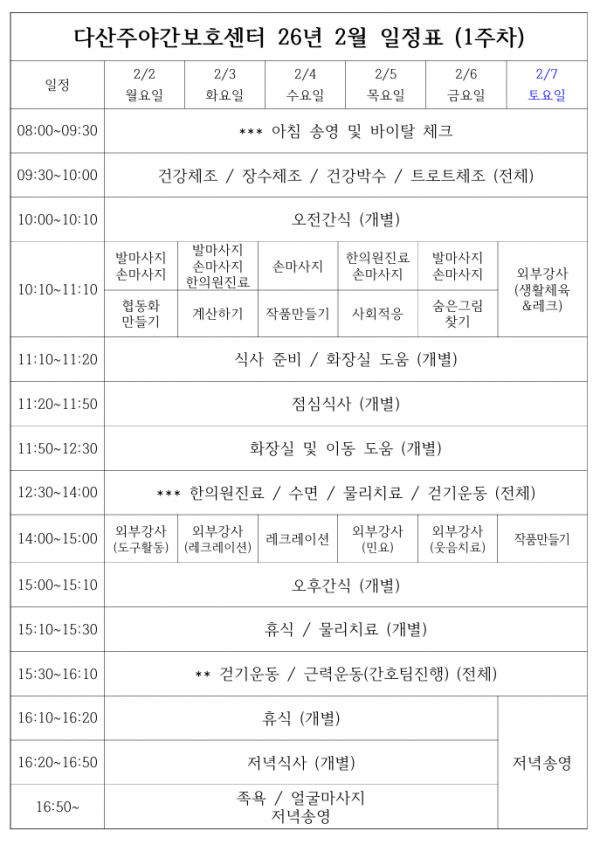 2월1주차 프로그램 운영 일정표 페이지 정보 작성자 명품다산주야간보호센터 작성일26-02-02 10:59 조회146회 댓글0건 관련링크 이전글 다음글 목록 본문 2월1주차 프로그램 운영 일정표 입니다. 이전글 다음글 목록