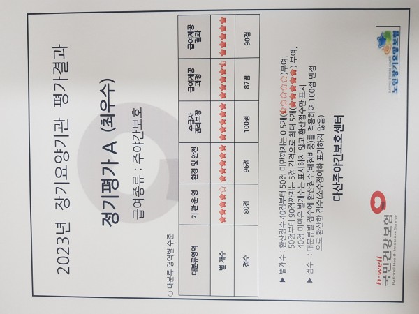 23년도 공단 평가에서 최우수 등급을 받았습니다. 페이지 정보 작성자 명품다산주야간보호센터 작성일24-03-11 15:19 조회1,003회 댓글0건 관련링크 이전글 다음글 목록 본문 23년 년말에 공단에서 실시한 기관평가에서당 센터는 모든 선생님들과 어르신들의협조로 "최우수"등급을 받았습니다.. 이전글 다음글 목록