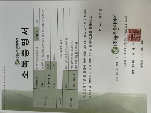 24년도 6월 정기소독을 실시 하였습니다... 페이지 정보 작성자 명품다산주야간보호센터 작성일24-06-21 07:59 조회794회 댓글0건 관련링크 이전글 다음글 목록 본문 어르신들이 생활하시는 센터에 깨끗한 환경과 감염병 예방을 위해정기 소독을 실시하였습니다..항상 쾌적한 환경속에서 어르신들의 건강과 안녕을 기원하면서항상 즐겁게 생활하도록 최선에 노력을 다하고 있습니다.."안심하고 생활할수 있는 명품다산주야간보호센터" 이전글 다음글 목록