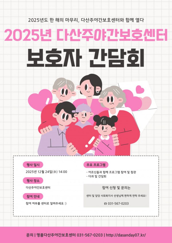 작성자 명품다산주야간보호센터 작성일25-12-08 09:45 조회46회 댓글0건관련링크