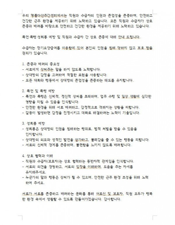 직원과 수급자의 상호존중 안내문(폭언,폭행,성희롱) 페이지 정보 작성자 명품다산주야간보호센터 작성일25-12-16 14:55 조회396회 댓글0건 관련링크 이전글 다음글 목록 본문 폭언, 폭행, 성희롱 예방 및 직원과 수급자의 상호존중 안내문 입니다. 이전글 다음글 목록