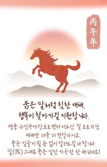 2026년 병오년 새해 복 많이 받으세요. 페이지 정보 작성자 명품다산주야간보호센터 작성일25-12-31 13:54 조회281회 댓글0건 관련링크 이전글 다음글 목록 본문 2026년 병오년 새해를 맞이하여 모든 어르신들과 어르신의 가족분들 그리고 직원 여러분들과직원들의 가족분들 모두 복많이 받으시고 건강하고 행복한 나날이 되시길 기원 드립니다. 이전글 다음글 목록