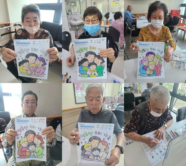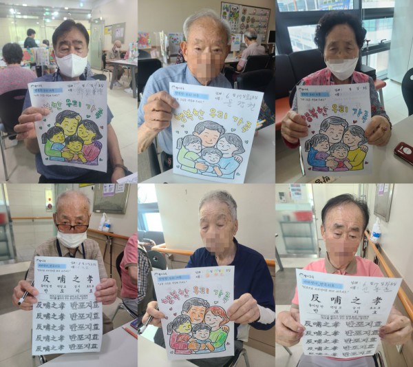 6월17일 인지활동 프로그램 Info. Writer 명품다산주야간보호센터 Date 25-06-17 12:01 View542 Reply0 Link 이전 다음 목록 Content "행복한 우리가족"에 대해서 생각해 보시면서 예쁘게 색칠해 보기!!"반포지효"에 대한 사자성어에 대해서 알아보고 한자와 한글을 따라 써보기!! 이전 다음 목록