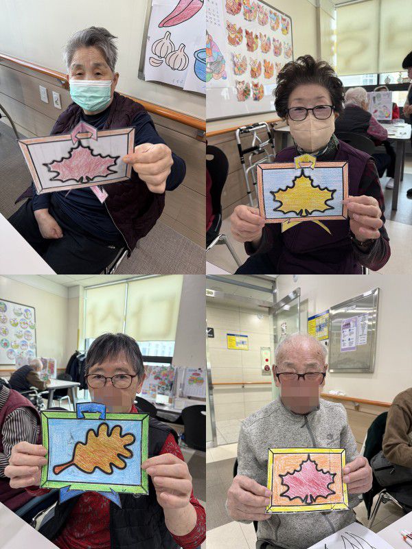11월22일 인지활동 프로그램 Info. Writer 명품다산주야간보호센터 Date 25-11-23 10:58 View133 Reply0 Link 이전 다음 목록 Content 가을의 나무잎 액자를 예쁘게 만들어 보기로 그림판을 예쁘게 색칠을 하고오리고 붙여서 모두 자기만의 멋진 액자를 만들어 보시면서 재미있게 완성하였습니다. 이전 다음 목록