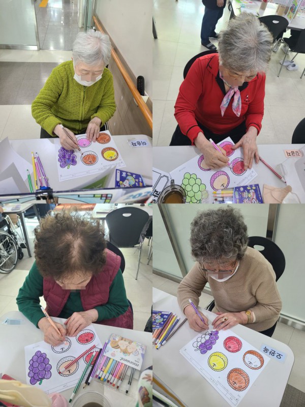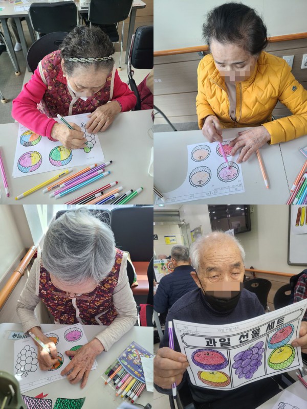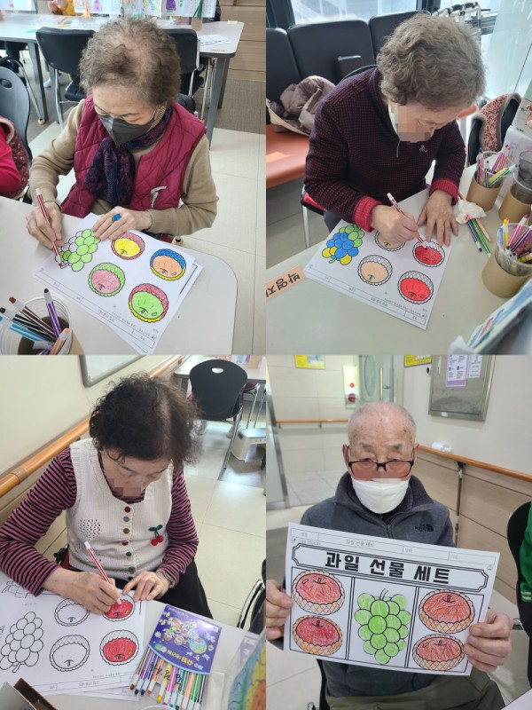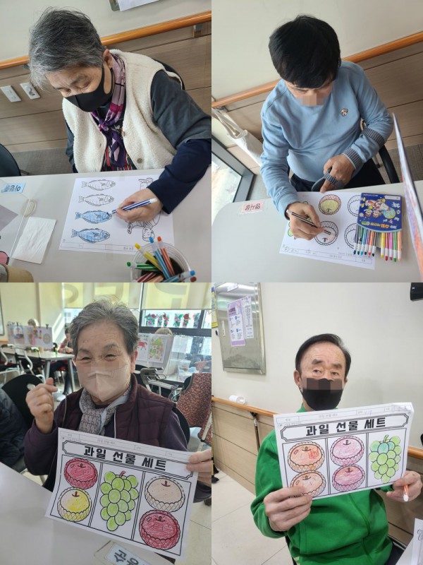 2월14일 인지활동 프로그램 Info. Writer 명품다산주야간보호센터 Date 26-02-14 15:06 View125 Reply0 Link 이전 다음 목록 Content 설날을 맞이하여 과일 선물 셋트를 꾸며보기로 과일을 색을 잘 골라서예쁘게 색칠을 하고 오려서 붙여서 먹음스러운 과일셋트 완성해 보기!! 이전 다음 목록