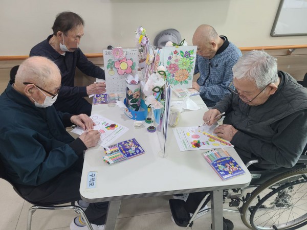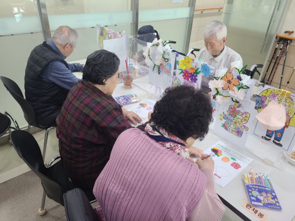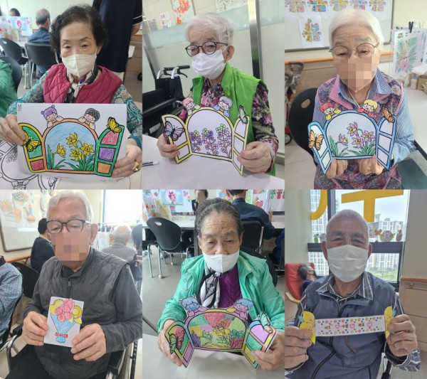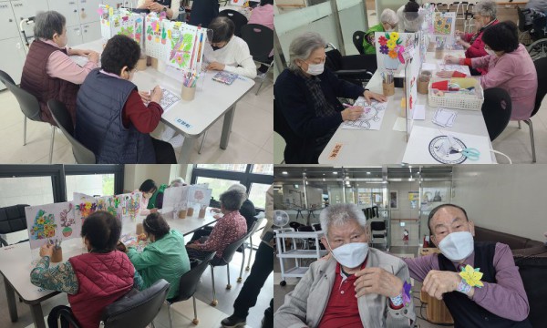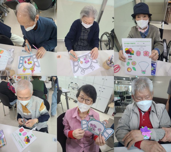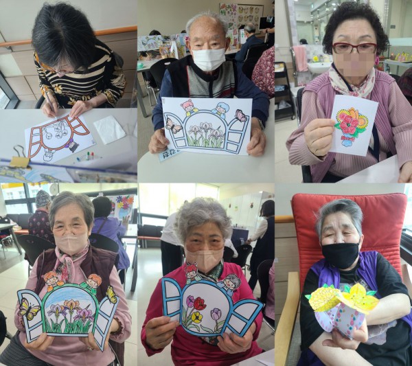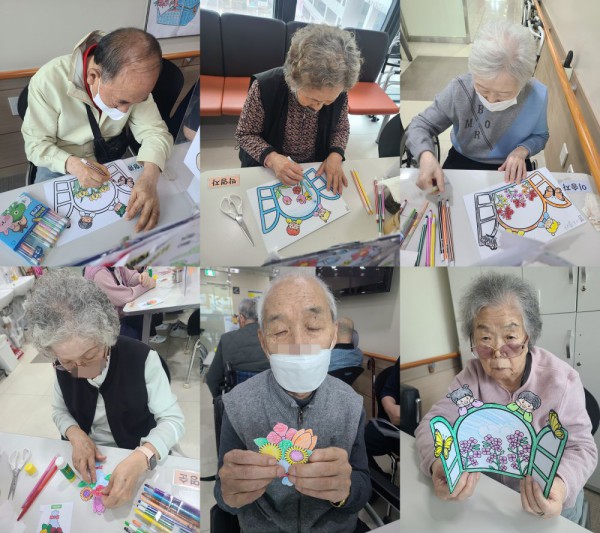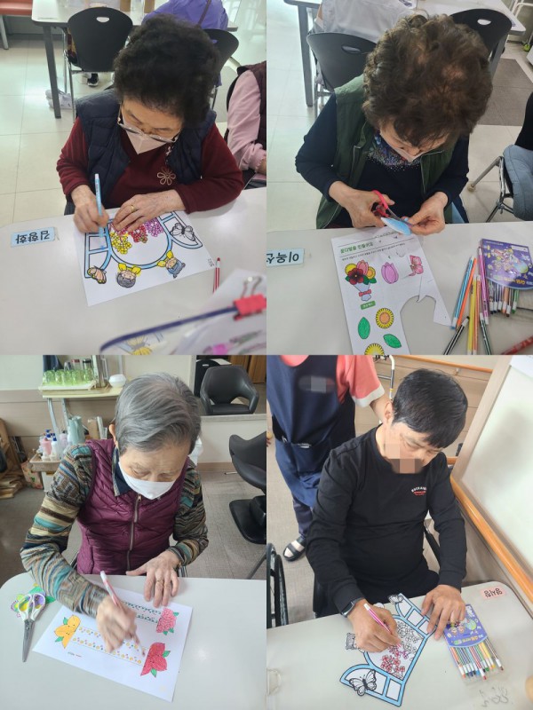4월22일 (수요일) 인지활동 프로그램 Info. Writer 명품다산주야간보호센터 Date 26-04-22 12:02 View20 Reply0 Link 이전 다음 목록 Content 창문을 열고 봄풍경을 감상하고 구경하는 것을 꾸며 보기로 색칠하고오려서 붙여서 완성해 보기!!꽃다발과 꽃팔찌를 색칠하고 오려서 예쁘게 만들어 보기!! 이전 다음 목록